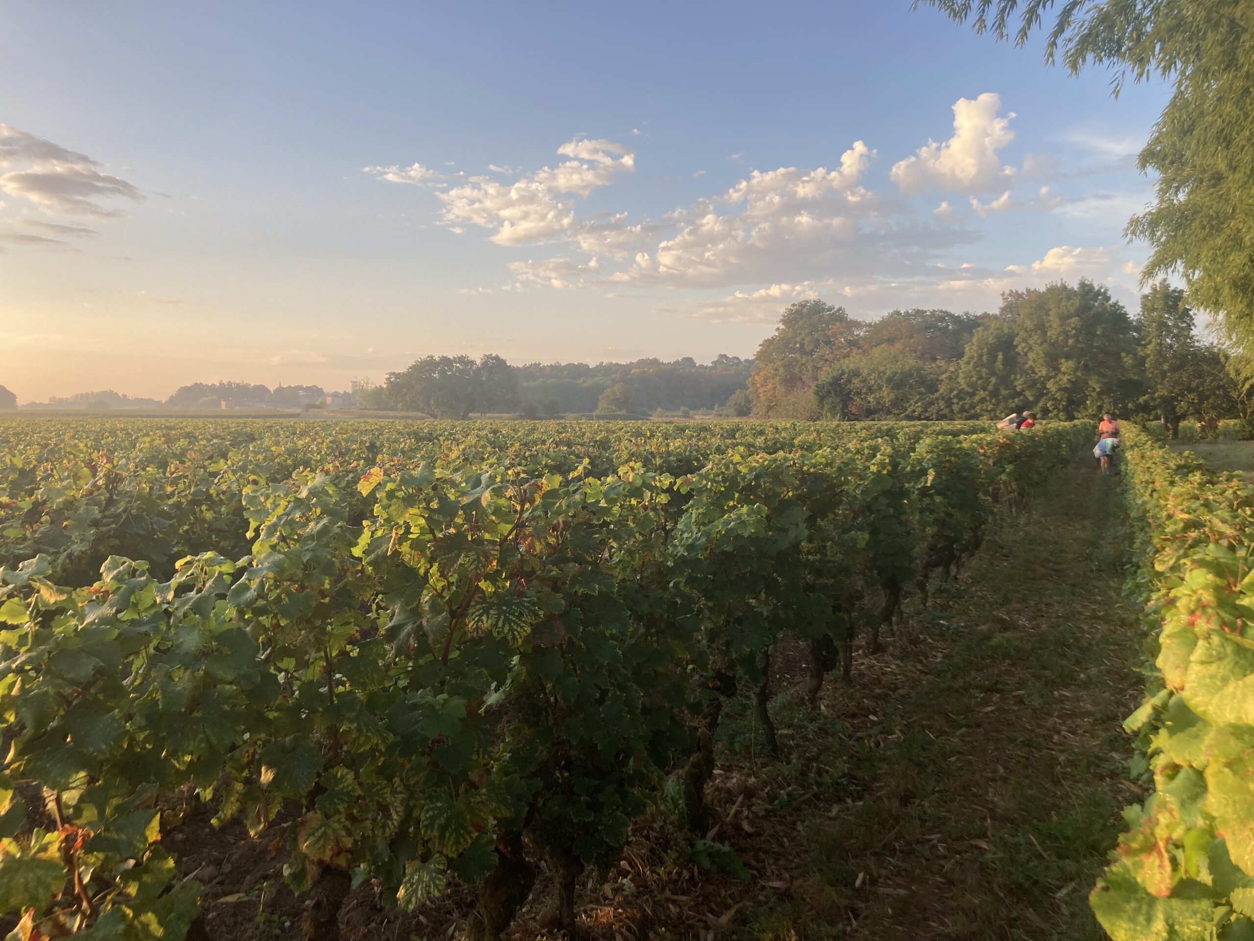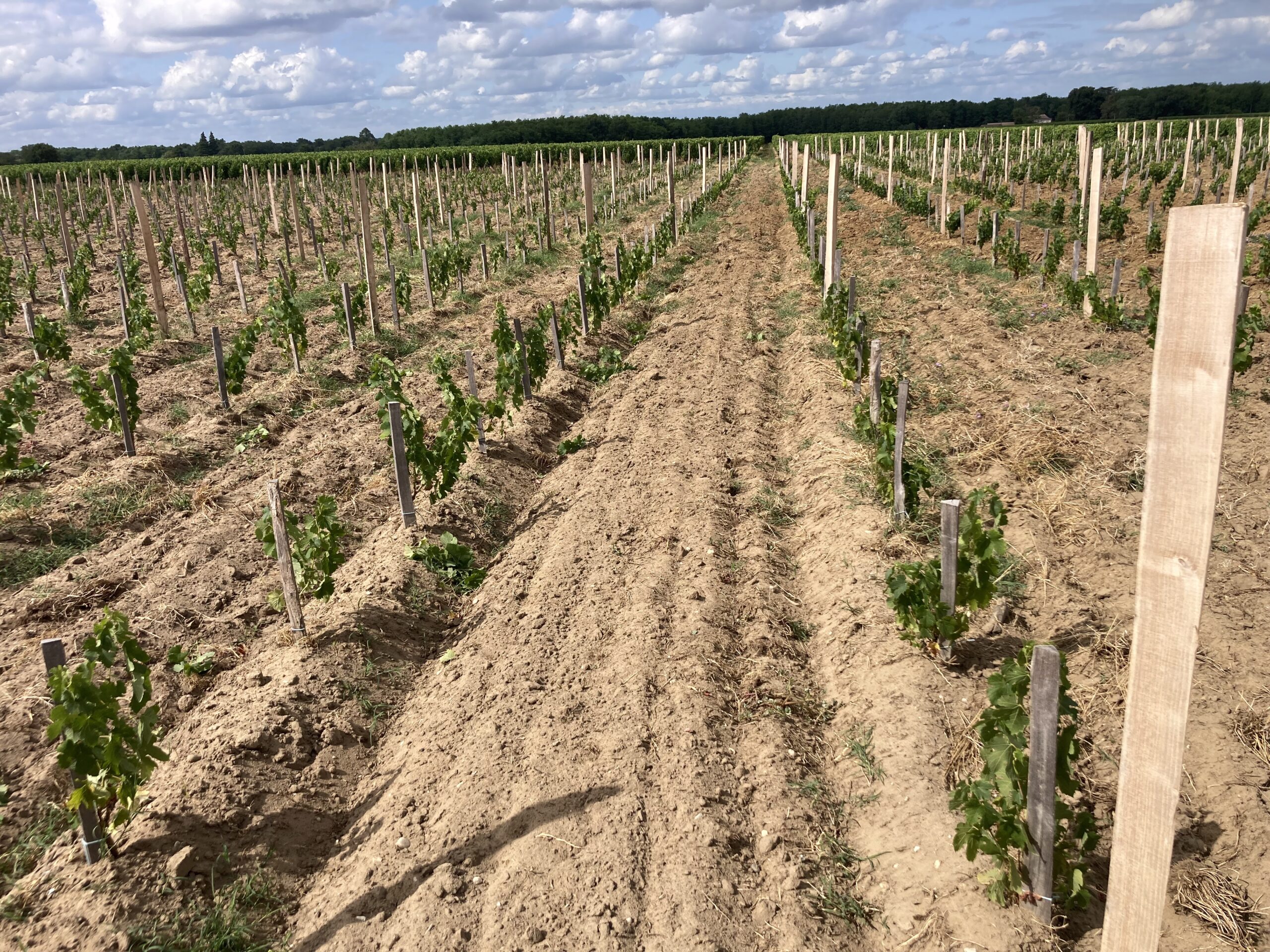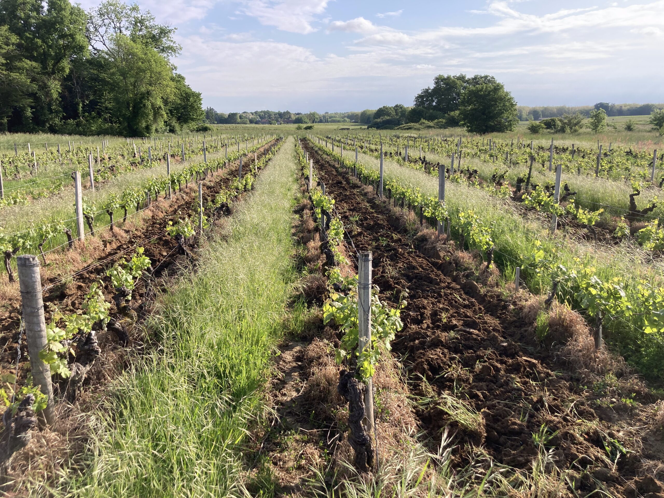Sur notre domaine, les terres sont travaillées de manière raisonnée, avec un travail du sol au niveau des pieds et un rang sur deux, tandis que les autres rangs restent enherbés.